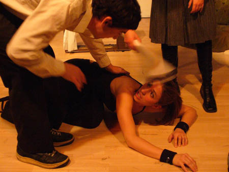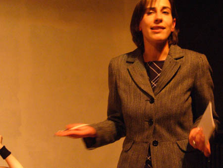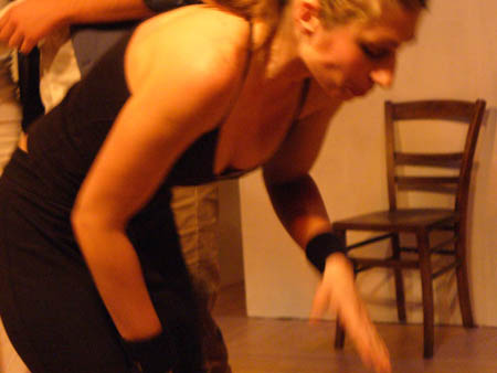 zum Sprechen. Vor dem Laken ein Bürostuhl. Herakles tritt auf.