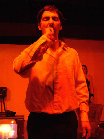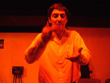 im Schatten zu sehen ist. Er redet nicht, er bedient einen Kassettenrekorder