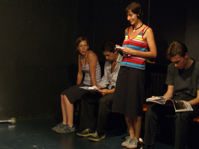 im Schatten zu sehen ist. Er redet nicht, er bedient einen Kassettenrekorder