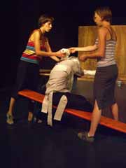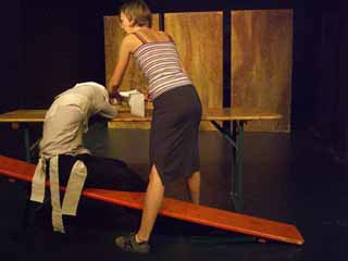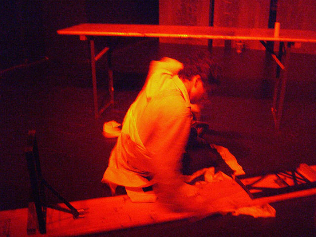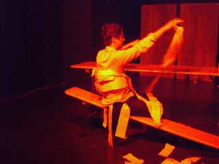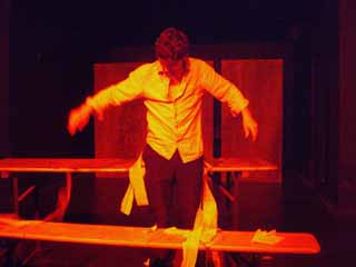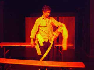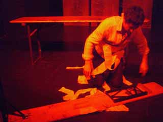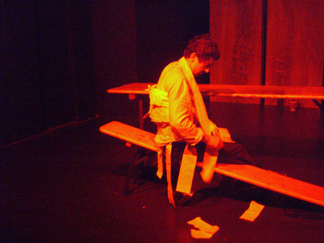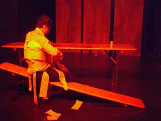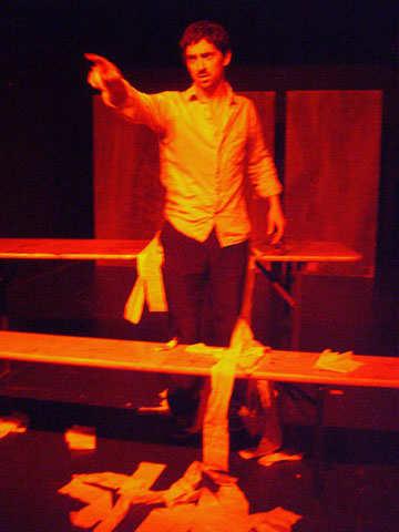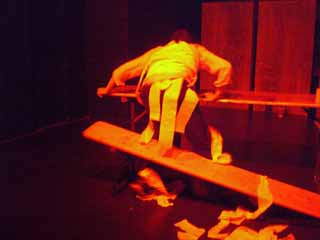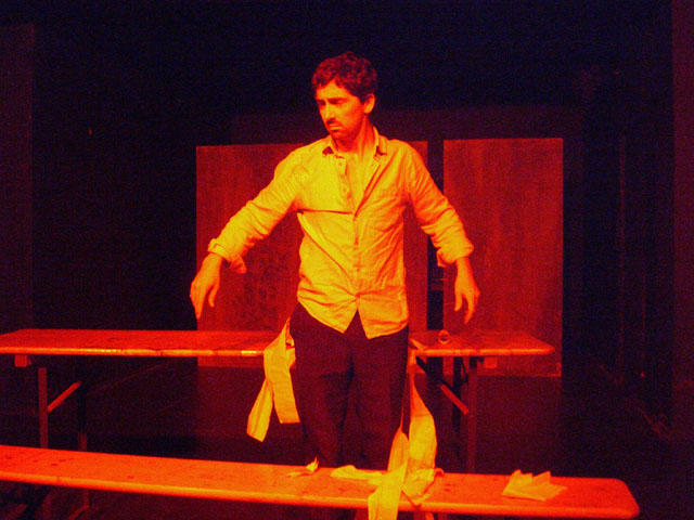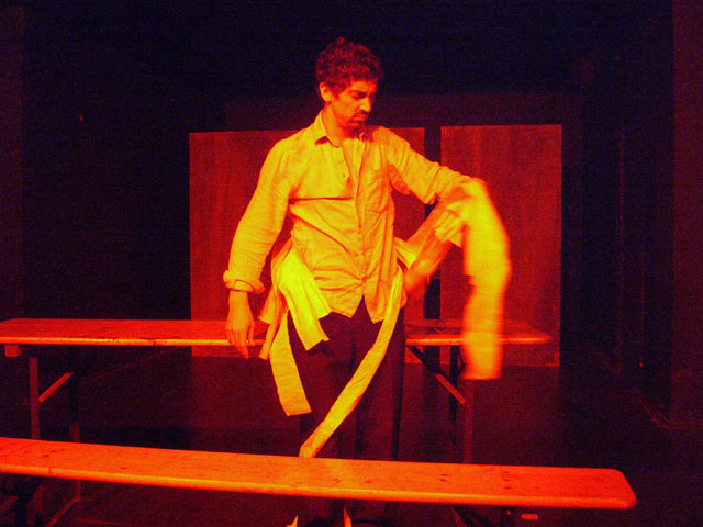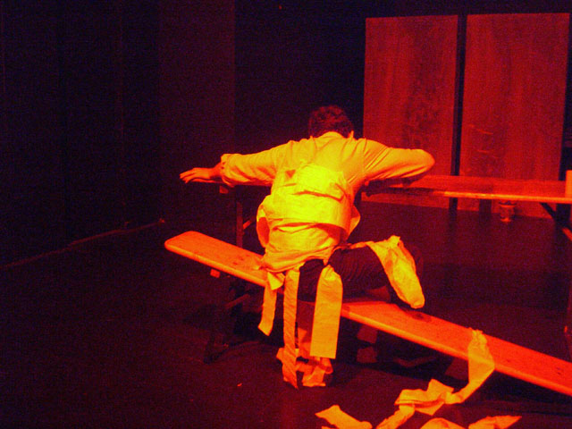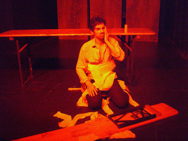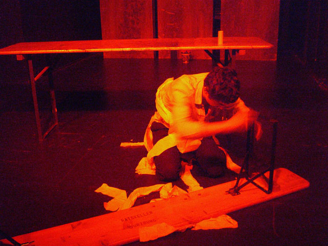 zum Sprechen. Vor dem Laken ein Bürostuhl. Herakles tritt auf.